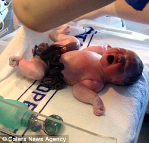 The rest of his organs were hung in a bag above his stomach in the hope that they would fall back into place. And a second operation the following morning allowed them to do just that.