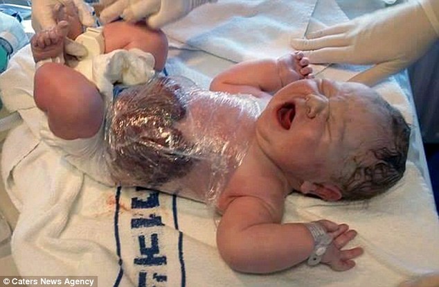 Doctors were forced to wrap Jack Hearne in kitchen cling film, in seconds after he was delivered naturally, to stop the chance of infection and keep his organs close to his body, in a desperate attempt to save his life.