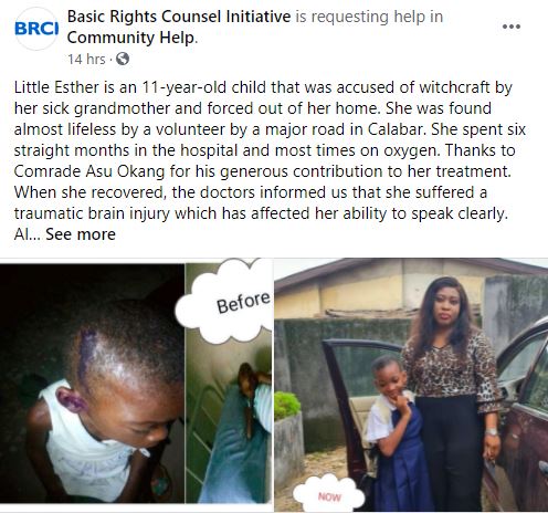 “Little Esther is an 11-year-old child that was accused of witchcraft by her sick grandmother and forced out of her home. She was found almost lifeless by a volunteer by a major road in Calabar. She spent six straight months in the hospital and most times on oxygen,”