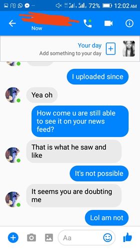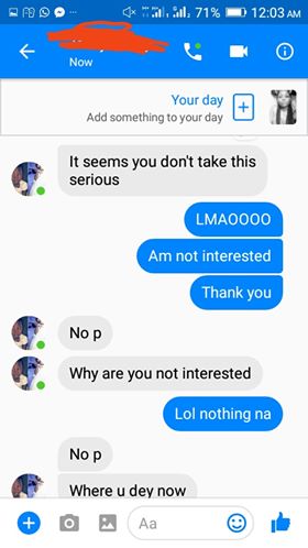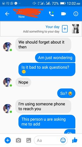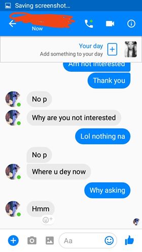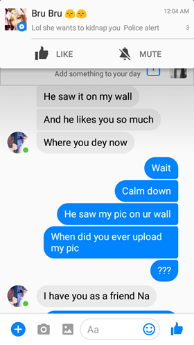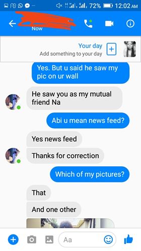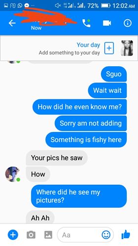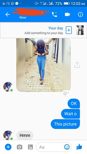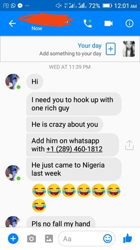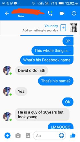 According to her, one of her Facebook friends, Bella (pseudonym) wanted to hook her up with a guy, “David D Goliath”, saying he’s a 30 year guy who just got back from abroad and is looking to hook up with a girl.