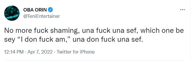 She tweeted on Wednesday, April 7, “No more fuck shaming, una fuck una sef, which one be sey “I don fuck am,” una don fuck una sef.”