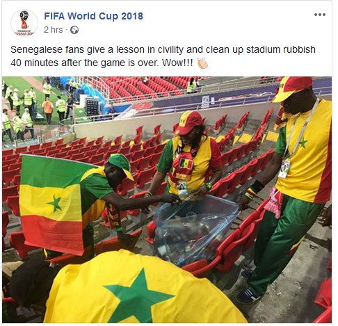 The fans showed their civil side by cleaning up the stadium joyfully as they celebrated Senegal’s 2-1 win over Poland in their opening game of Russia 2018 World cup.