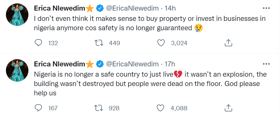 “Nigeria is no longer a safe country to just live. It wasn’t an explosion, the building wasn’t destroyed but people were dead on the floor. God please help us.