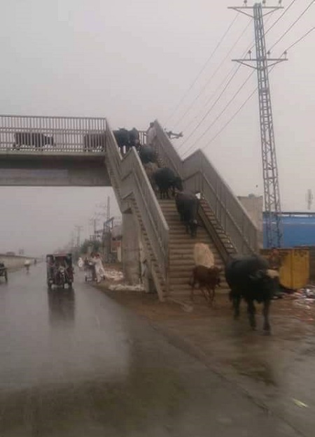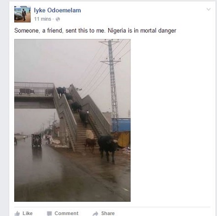 Facebook user, Iyke Odoemelam, says the country is in mortal danger as he shared this photo of cows using the same pedestrian bridge humans use to cross roads.