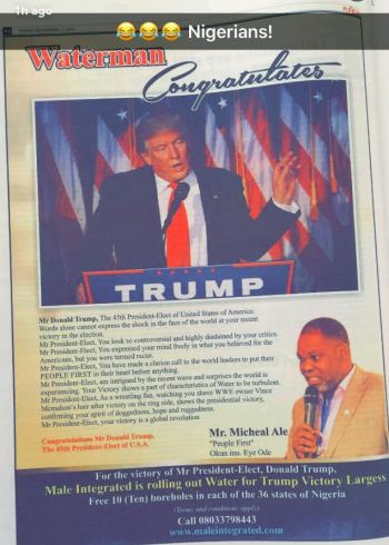 But seriously, what’s the point when the President-elect MAY NOT see it huh?! The advert you see in the Newspaper page above has been serving rounds over Nigerian social media – it shows a man felicitating with the new president elect of the United States.