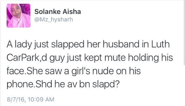 So it’s being reported newly that a lady SLAPPED her husband right in public at the Lagos University Teaching Hospital car park, because she saw girl’s nude photo on his phone.