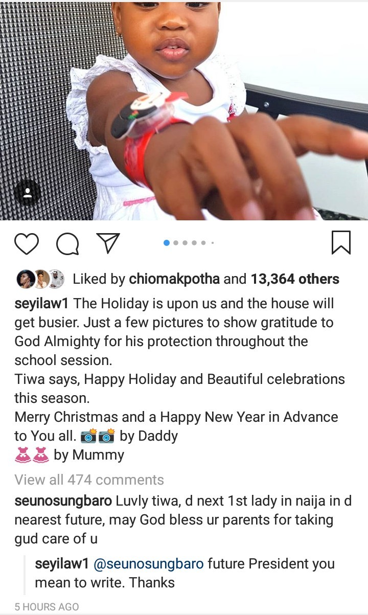 The comedian had shared lovely photos of his adorable daughter and a follower commented saying Tiwa is “the next first lady in Naija in the nearest future“.