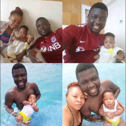 The cute little toddler has her daddy’s chubby chin and it’s absolutely adorable! The proud father shared this collage photos as he and his wife takes their daughter, Tiwa on her first swimming lesson.