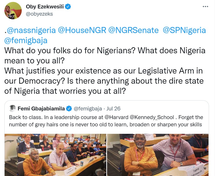 Former Minister of Education, Oby Ezekwesili has lambasted the Speaker of the House of Representatives, Femi Gbajabiamila, for posting photos from his class at Harvard Business School.