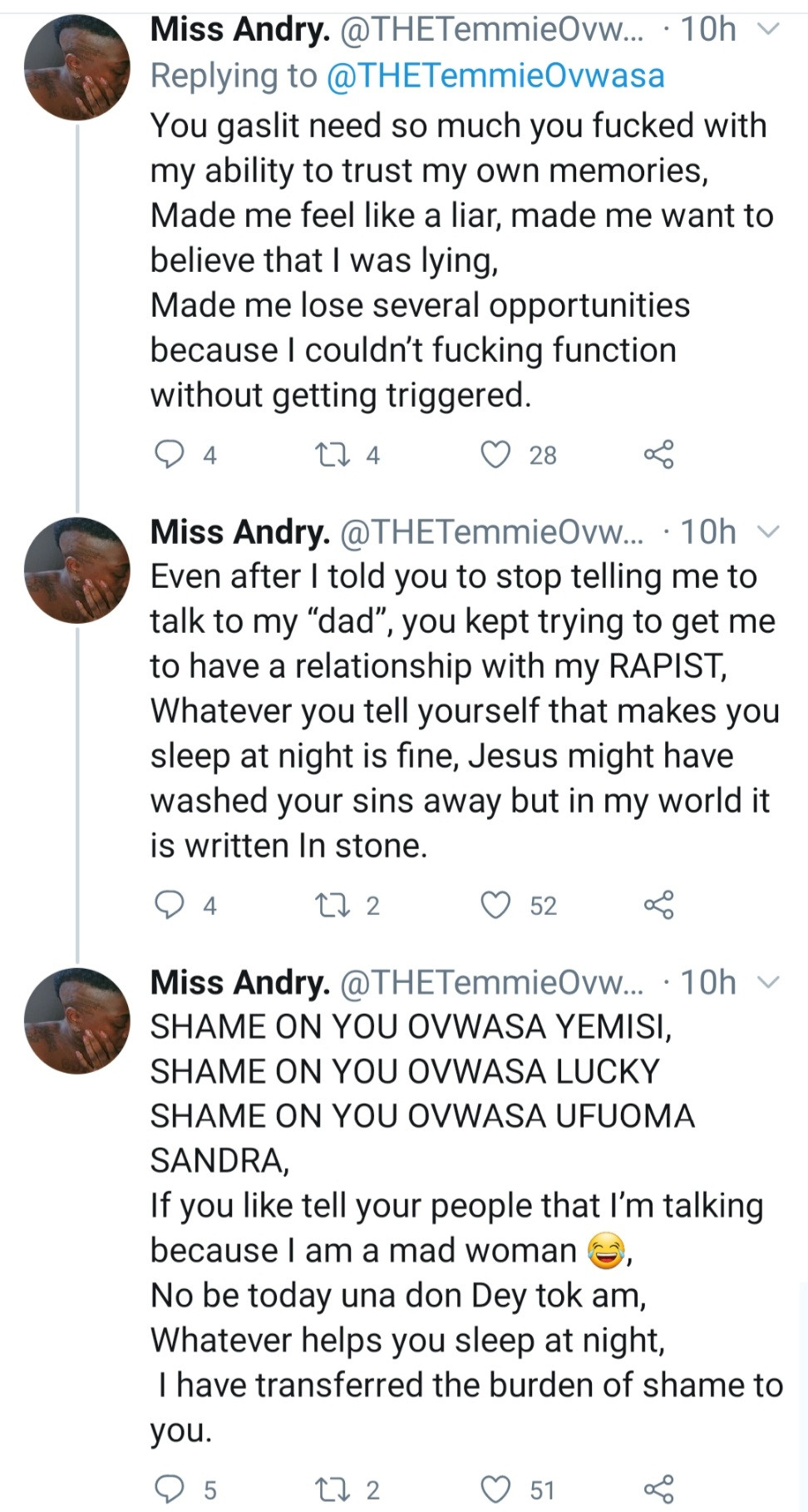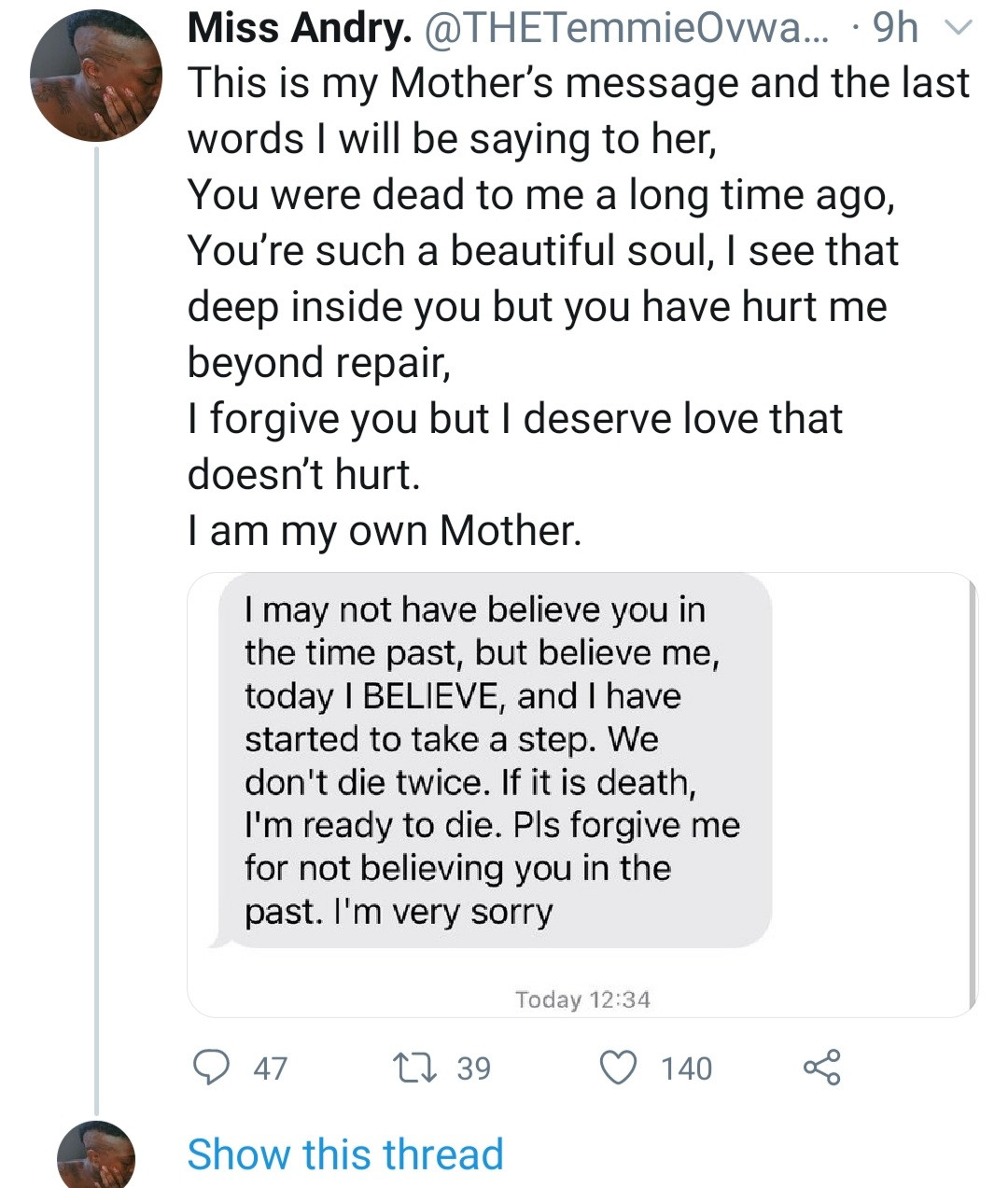 According to her, after she made the shocking revelation on Twitter yesterday, her mother reached out to her, asking for forgiveness for not believing her.