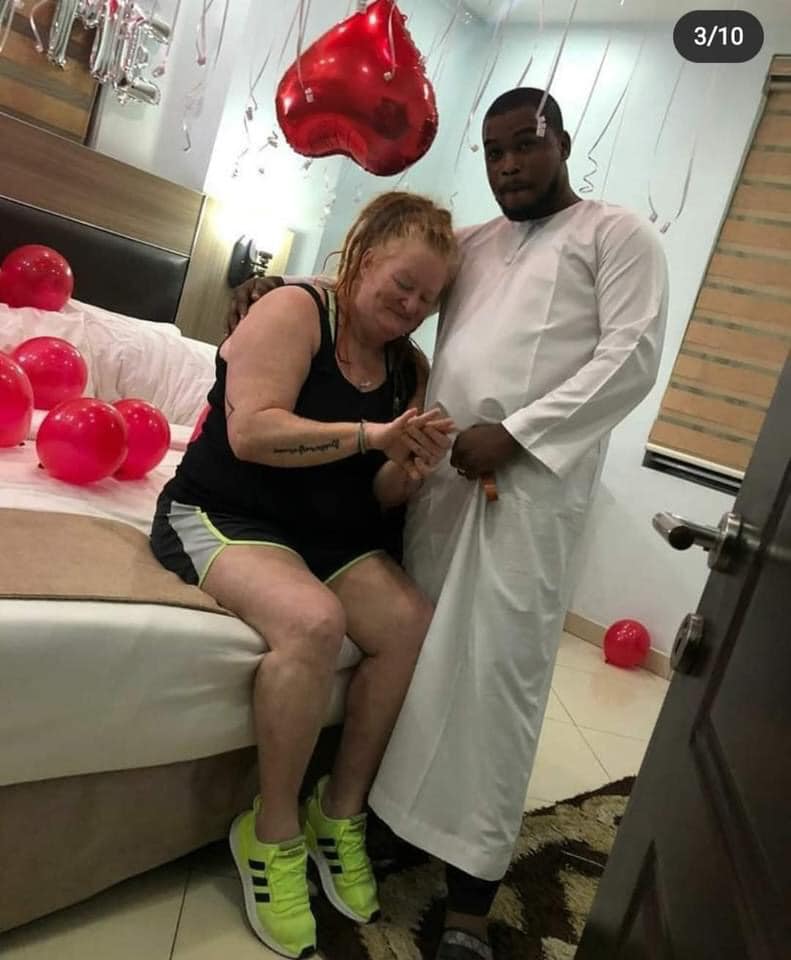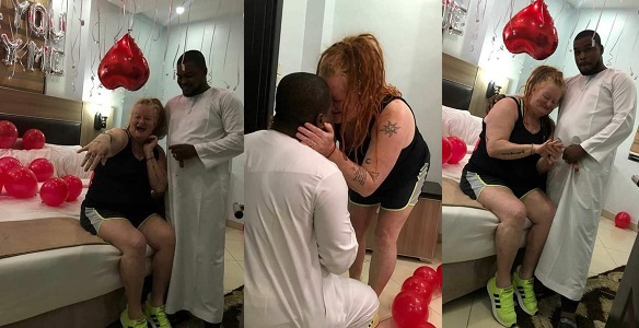 A Nigerian man is in a celebratory mood following his older white lover’s acceptance of his marriage proposal.