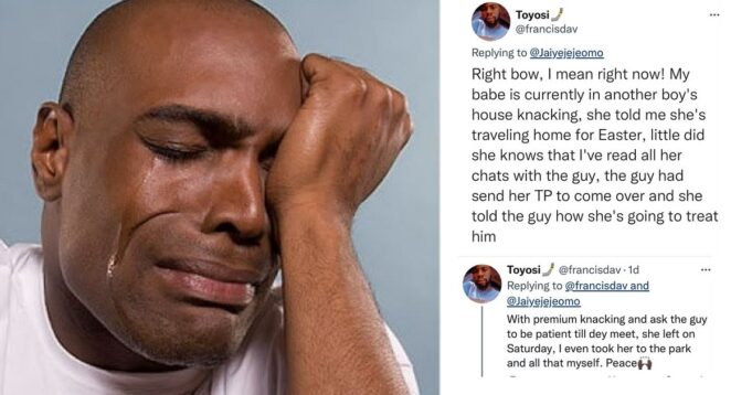 A Nigerian man has taken to micro-blogging website, Twitter to share the heartbreaking story of how he discovered that his girlfriend is cheating on him.