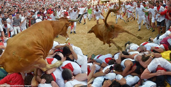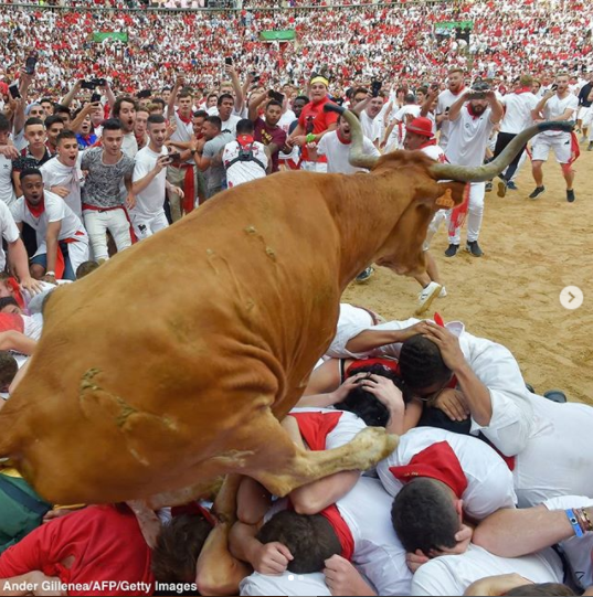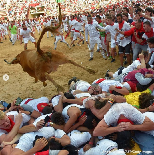 Multiple people were left injured at this year’s San Fermin festival in Pamplona, Spain after a bull jumped over them during the event.