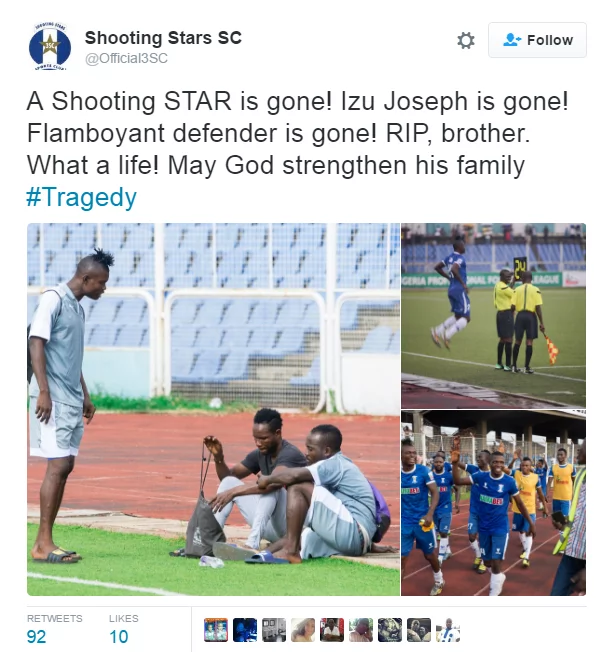 “A Shooting STAR is gone! Izu Joseph is gone! Flamboyant defender is gone! RIP, brother. What a life! May God strengthen his family #Tragedy”