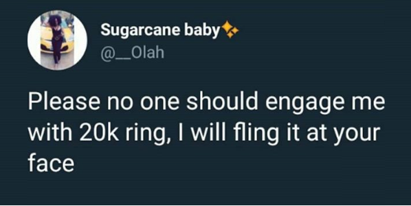 A Nigerian Lady is currently on fire on social media after she tweeted that she’s not so cheap, that she’d allow some guy propose to her with a N20,000 ring.