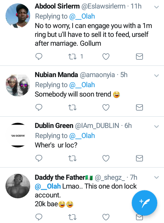 See as you be.you haven’t talk of seeing a serious and responsible man to gets married to let’s talk of 20k ring.see finger way go wear 20k ring.