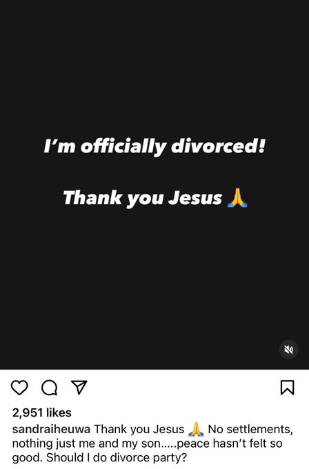 Sandra Iheuwa expressed excitement at the news by asking her fans if she should have a divorce party.