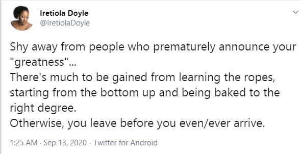 In her tweet, Ireti stated that one should stay away from people who prematurely announce their greatness because there is much to be gained from the learning ropes. She added that without being baked to the right degree, one can leave even before they arrive.