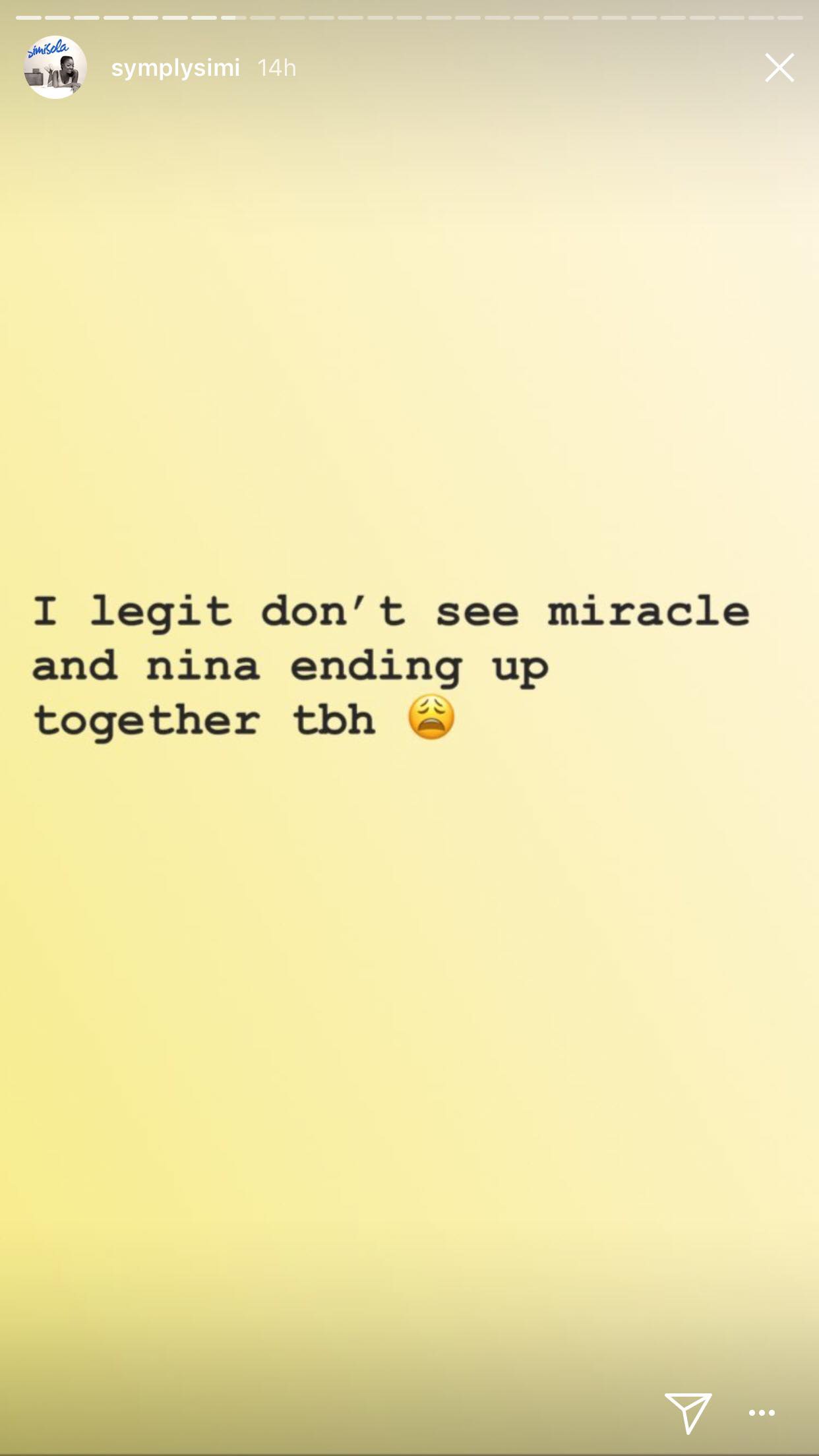 Remember that Miracle and Nina started dating almost immediately after they got into the house and remained inseparable till the end and while many of their fans are in high hopes that they’ll continue, ‘Joromi‘ crooner, Simi believes that Miracle will sideline Nina now that the game is up.