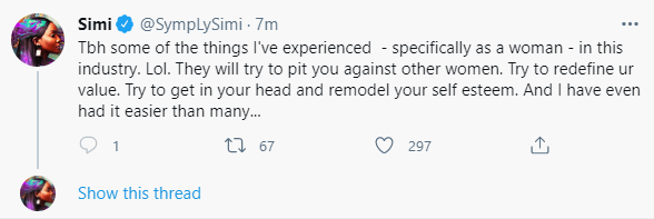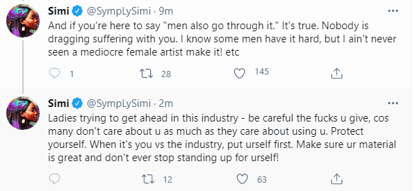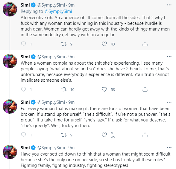 Simi who claimed to have been triggered by Ndidi’s post, in a lengthy Twitter thread detailed the challenges female artiste encounter in the industry. According to her, the female entertainers are constantly pitted against each other and can hardly get away with the kind of things men in the industry get away with.
