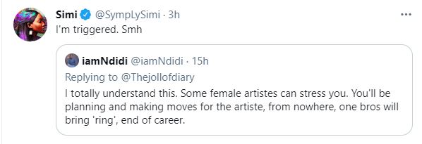 “Some female artistes can stress you. You’ll be planning and making moves for the artiste, from nowhere, one bros will bring ‘ring’, end of career”. he tweeted.
