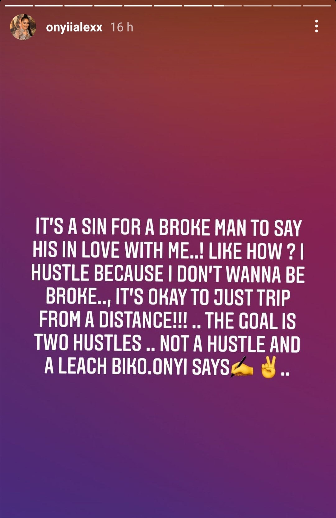 The actress made her stance known via her Instagram Stories, where she also called a broke man a leach and that such men can only trip for her from a distance.