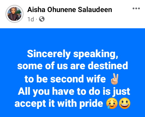 A Nigerian lady, Aisha Ohunene Salaudeen, from Kogi State, has sparked a conversation with her statement that certain women are destined to be second, third, or even fourth wives.