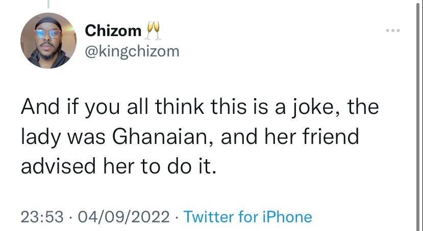 And if you all think this is a joke, the lady was Ghanaian, and her friend advised her to do it.”
