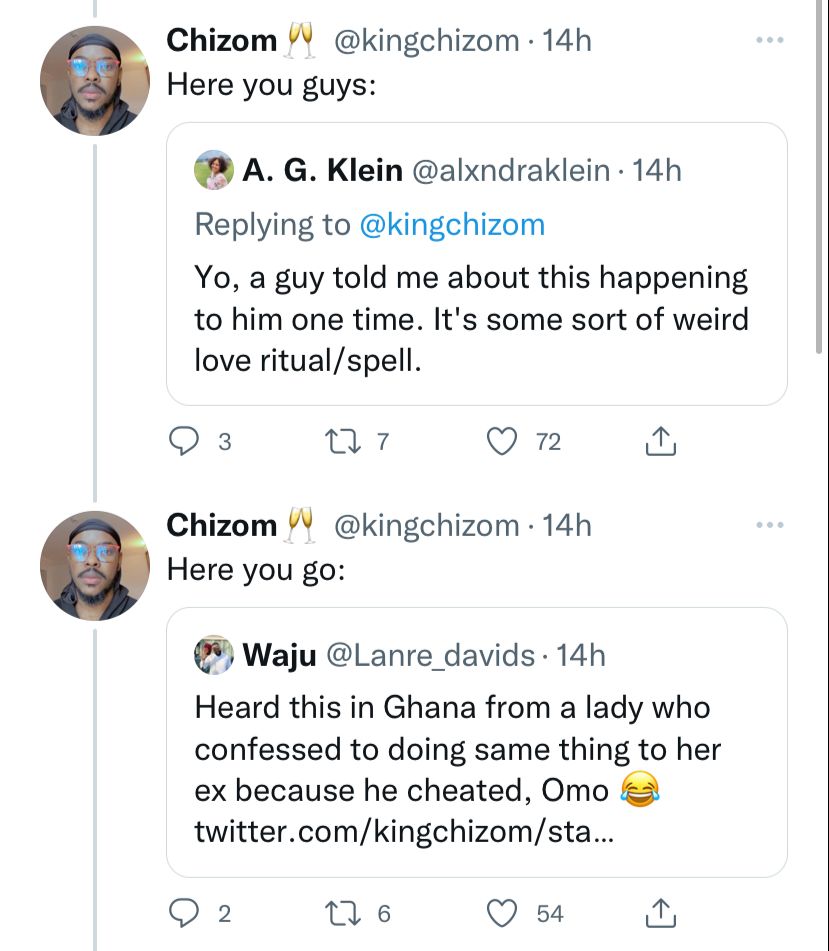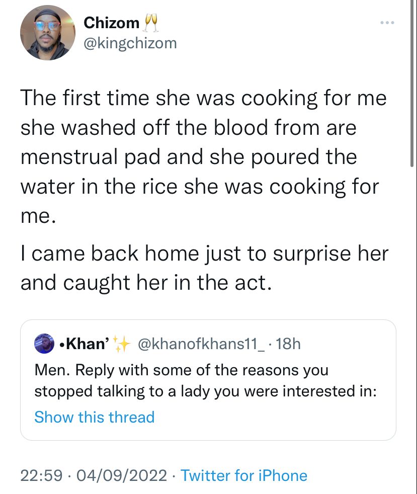 Taking to Twitter to narrate the shocking incident in reaction to a tweet that asked men for the reason they stopped talking to a lady they were interested in, Chizom said he caught her red-handed cooking for him with her menstrual blood.
