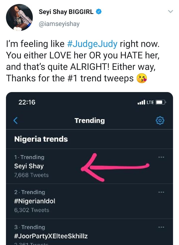 “I’m feeling like #JudgeJudy right now. You either LOVE her OR you HATE her, and that’s quite ALRIGHT! Either way, Thanks for the #1 trend tweeps”