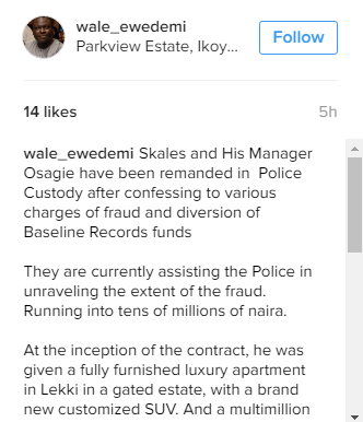 Wale wrote on Instagram that at the inception of the contract, Skales was given a fully furnished luxury apartment in Lekki in a gated estate, with a brand new customized SUV. And a multimillion Naira sign on Fee.
