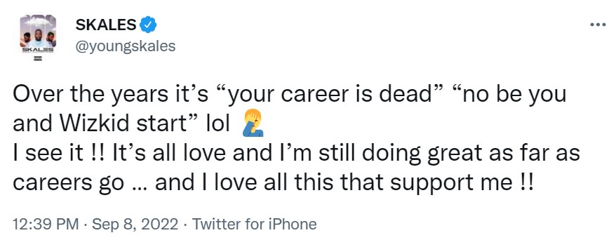Taking to Twitter on September 9, Skales said he sees all the negative comments, especially those who compare his music career with that of his former record label mate, Wizkid.