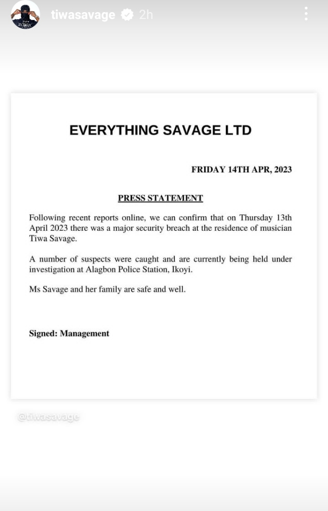 “Following recent reports online, we can confirm that on Thursday, April 13, 2023, there was a major security breach at the residence of musician Tiwa Savage.