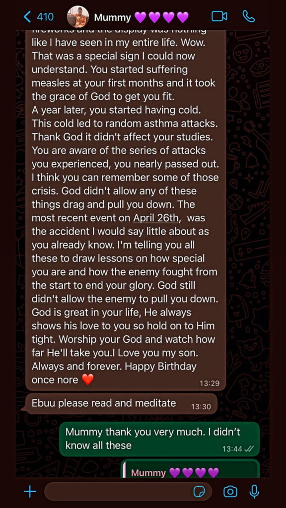 “I’m telling you all these to draw lessons on how special you are and how the enemy fought from the start to end your glory,” his mother wrote.