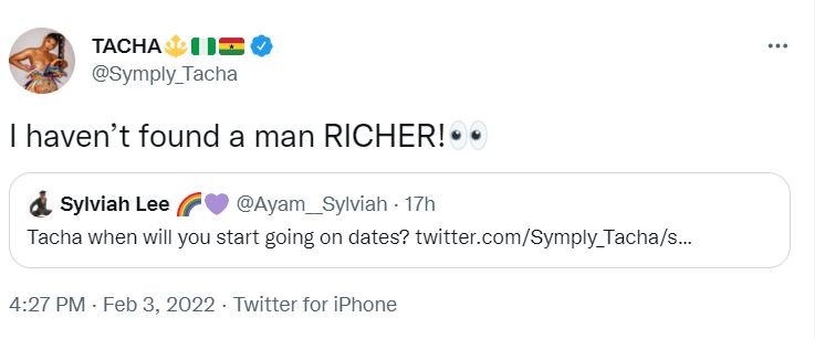 Responding to the question, Tacha explained that she’s still single and hasn’t been going on dates because she has yet to find a man that’s richer than her.