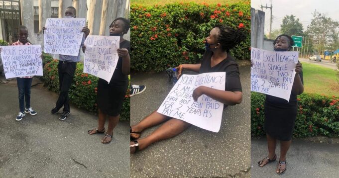 A single mother and her children staged a peaceful protest in front of the Cross River State Governor’s office on Monday, January 4th, over alleged non-payment of 2 years salary.
