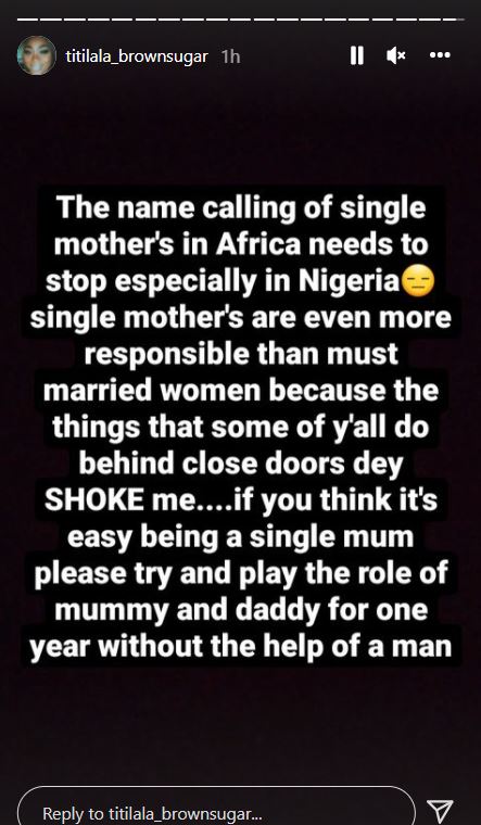 The single mother of one made this assertion in a post shared on her Insta-stories demanding that the name-calling of single mums in Africa, especially in Nigeria should stop.