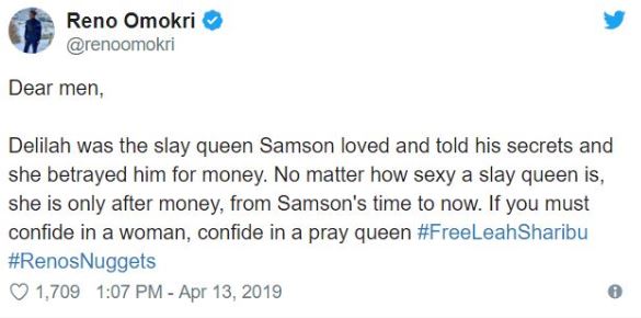 Delilah was the slay queen Samson loved and told his secrets and she betrayed him for money. No matter how sexy a slay queen is, she is only after money, from Samson’s time to now. If you must confide in a woman, confide in a pray queen #FreeLeahSharibu #RenosNuggets