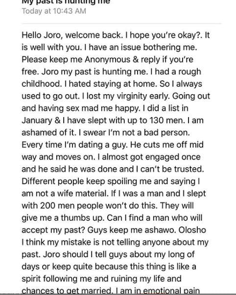 Relationship blogger, Joro Olumofin as is his usual wont, took to his page to share an email he received from a lady who is finding it difficult to get married due to her ugly past.