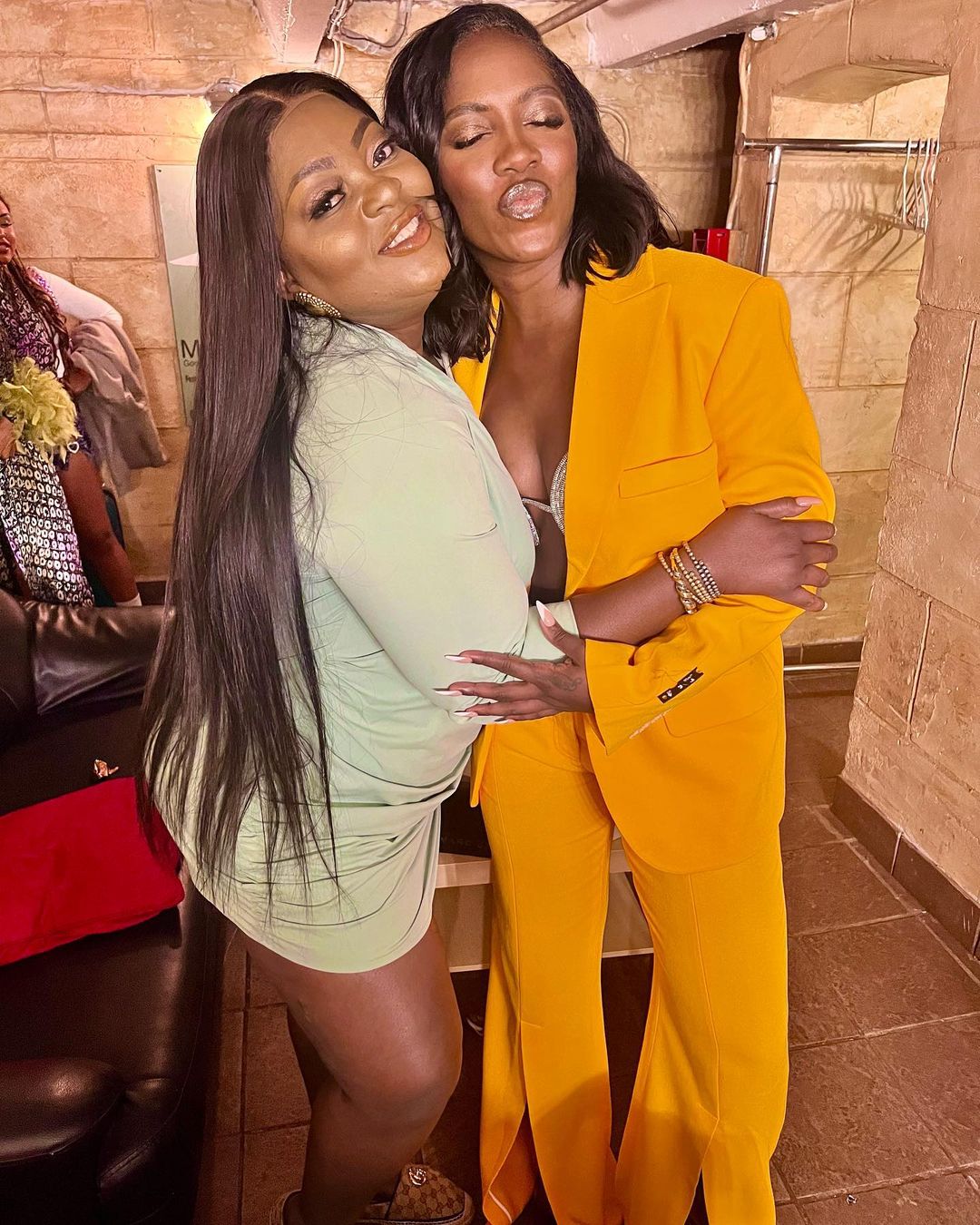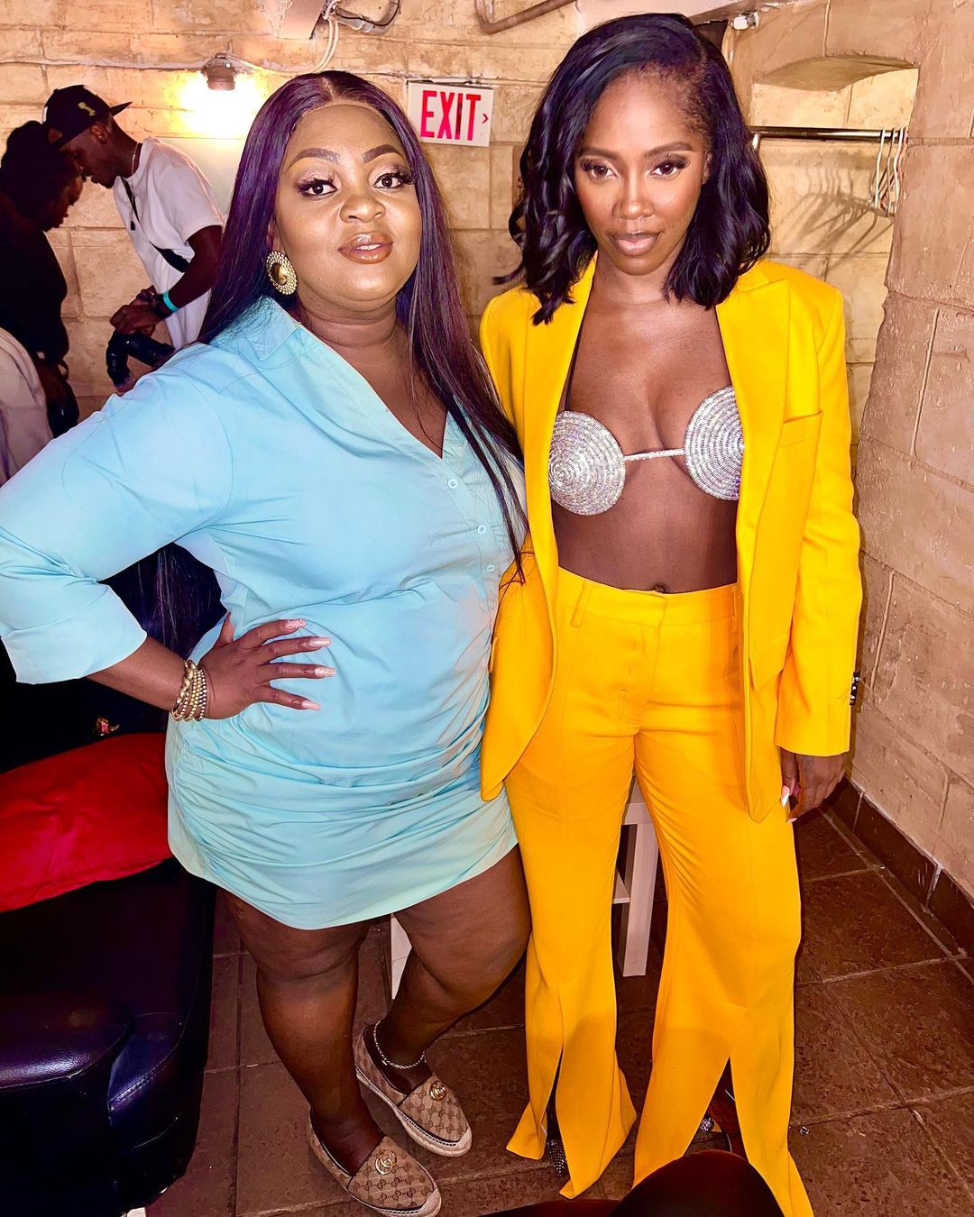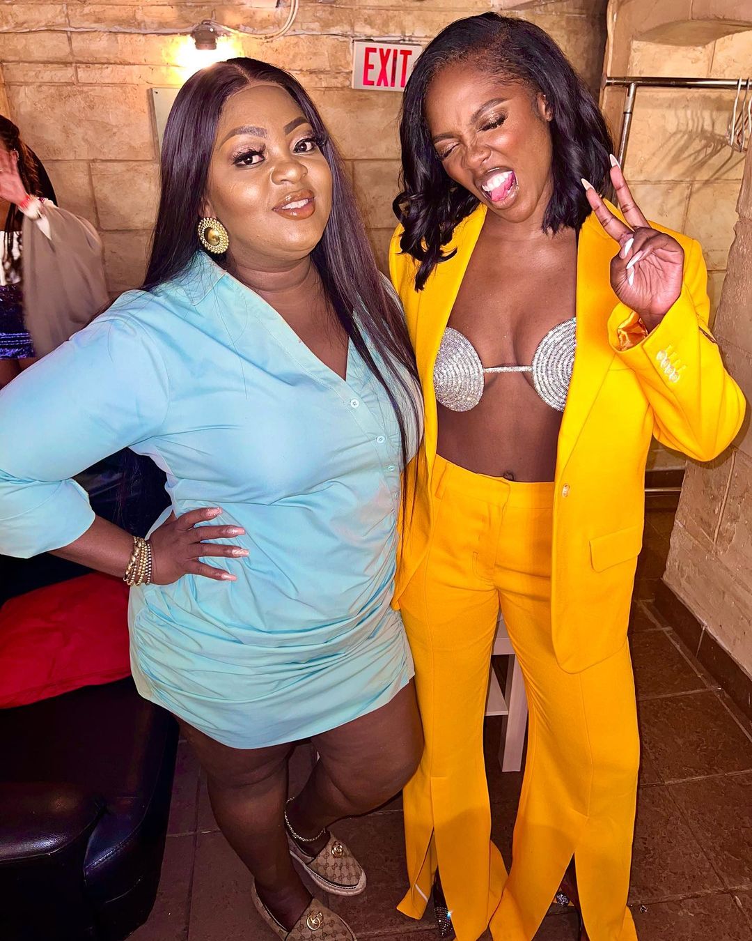 During her ‘Water and Garri’ concert recently, the singer is seen rocking a yellow suit left unbuttoned with a tiny brassiere while striking a pose with actress, Eniola Badmus.