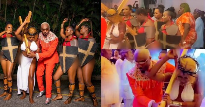 Controversial Nigerian socialite, Pretty Mike as is his usual wont, displayed a scene when he attended the wedding ceremony of comedian, Funnybone over the weekend, as he arrived at the venue with semi-nude ladies who depicted the story of Jesus carrying the cross and being flogged as he made his way to Golgotha.