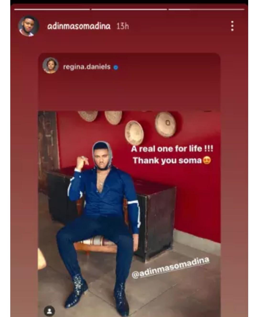 In reaction to Regina’s statement, Somadina took to his own Instagram page to repost Regina’s message as a sign of acknowledgement.