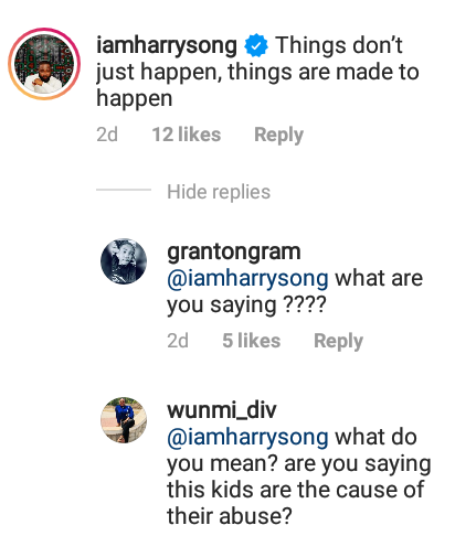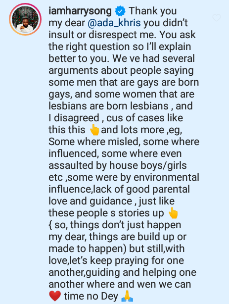 Reacting to the issue, Harrysong disagreed with the popular notion that homosexuals are born gay. According to him, some people were misled and influenced by environmental factors, childhood sexual abuse, lack of parental love and guidance.