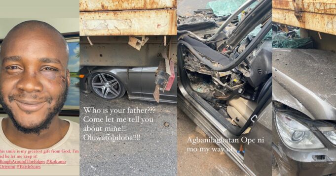 The gentleman, identified as Ade Ori-Okin on Twitter, was in an accident at the Jabi/Kado bridge in Abuja but came out alive with only a little scratch on his face.