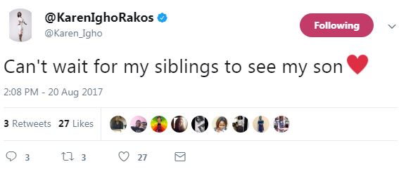 Winner of the 2011 Big Brother Africa, Karen Igho Rakos took to her Twitter page to reveal that her son is not feeling too well, and also said a word of prayer for him.