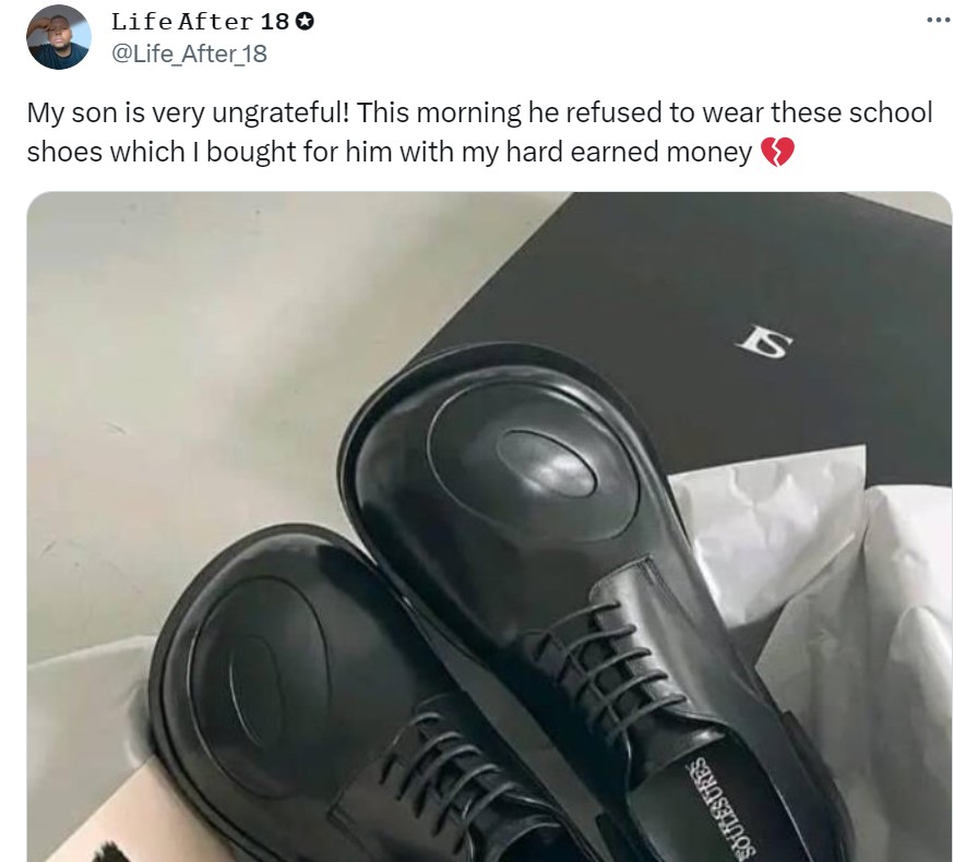He wrote; “My son is very ungrateful! This morning he refused to wear these school shoes which I bought for him with my hard earned money”