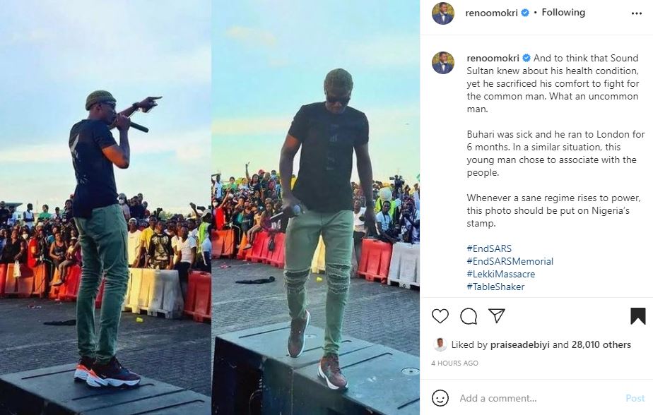 Former Presidential aide, Reno Omokri has heaped praises on late singer, Sound Sultan for his contribution at the 2020 #EndSARS protest.
