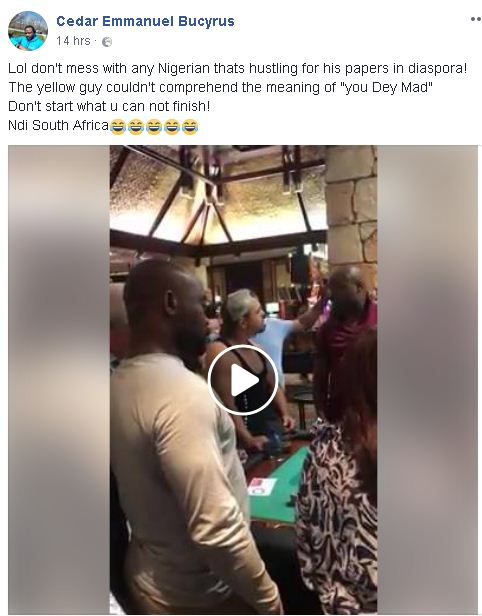 A social media user, Cedar Emmanuel Bucyrus has taken to Facebook to share a shocking video showing a Nigerian man beating the hell out of a racist South African man who tried to bully him.