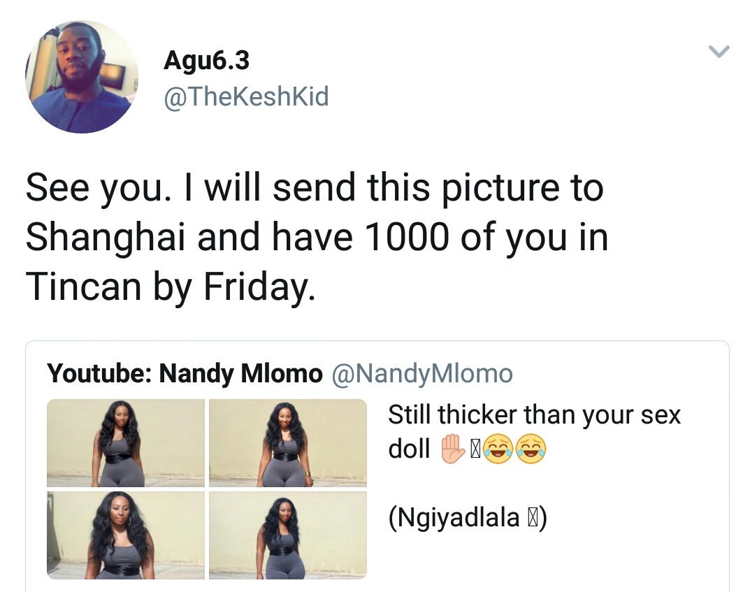 After the photos of a new sex doll which will be sold for over N800k went viral, a South African blogger Nandy Mlomo took to her Twitter page to share sexy photos to prove that she is sexier.