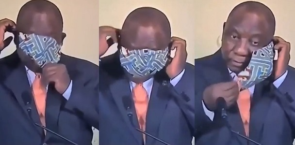 South Africa President Cyril Ramaphosa was captured struggling to get his facemask on after delivering a speech on the importance of wearing them, in a blunder livestreamed yesterday.